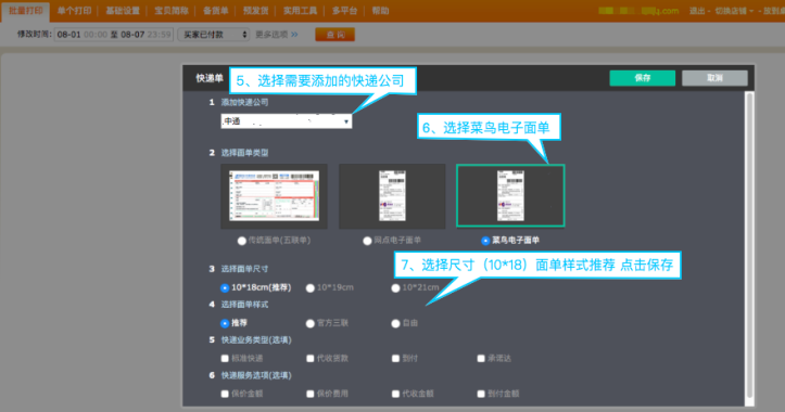 批量打印页面下,搜索订单-勾选需要打印的订单-勾选需要打印的快递单模版-点击打印